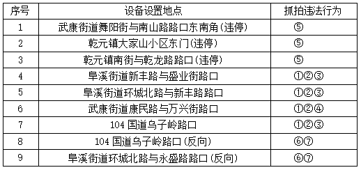 为进一步加强道路交通安全管理,我县公安机关交通管理部门新增复用9处固定式交通技术监控设备,将于2025年4月1日启用。启用后将对①“驾驶机动车违反道路交通信号灯通行的”,②“机动车通过有灯控路口时,不按所需行进方向驶入导向车道”,③“驾驶机动车违反禁止标线指示的”,④“驾驶机动车在高速公路、城市快速路以外的道路上逆向行驶的”,⑤“机动车不按规定临时停车影响其他车辆和行人通行的”,⑥“驾驶时拨打接听手持电话的”,⑦“驾驶机动车在高速公路以外的道路上行驶时,驾驶人未按规定使用安全带的”行为进行抓拍。具体设置点位及抓拍违法行为: