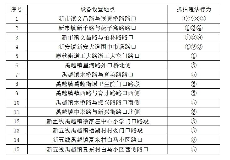 为进一步加强道路交通安全管理,我县公安机关交通管理部门新增复用15处固定式交通技术监控设备,将于2025年7月14日启用。启用后将对①“驾驶机动车违反道路交通信号灯通行的”,②“机动车通过有灯控路口时,不按所需行进方向驶入导向车道”,③“驾驶机动车违反禁止标线指示的”,④“驾驶机动车在高速公路、城市快速路以外的道路上逆向行驶的”,⑤“机动车不按规定临时停车影响其他车辆和行人通行的”行为进行抓拍。具体设置点位及抓拍违法行为: