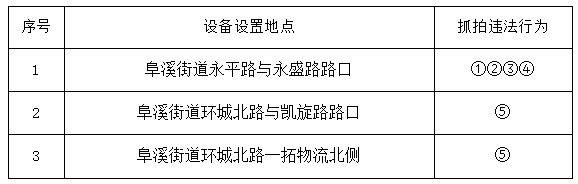 为进一步加强道路交通安全管理,我县公安机关交通管理部门新增复用3处固定式交通技术监控设备,将于2025年11月10日启用。启用后将对①“机动车不按照交通信号灯规定通行的”,②“机动车通过有灯控路口时,不按所需行进方向驶入导向车道”,③“驾驶机动车违反禁止标线指示的”,④“驾驶机动车在高速公路、城市快速路以外的道路上逆向行驶的”,⑤“机动车不按规定临时停车影响其他车辆和行人通行的”行为进行抓拍。