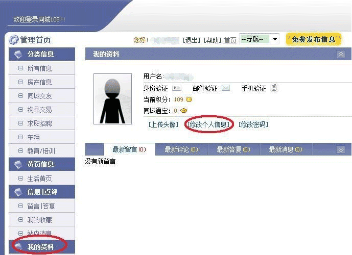 答:在登录后点击“管理我的信息”进入“管理首页”,在“我的资料”中点击“修改个人信息”进行个人资料修改。如图: